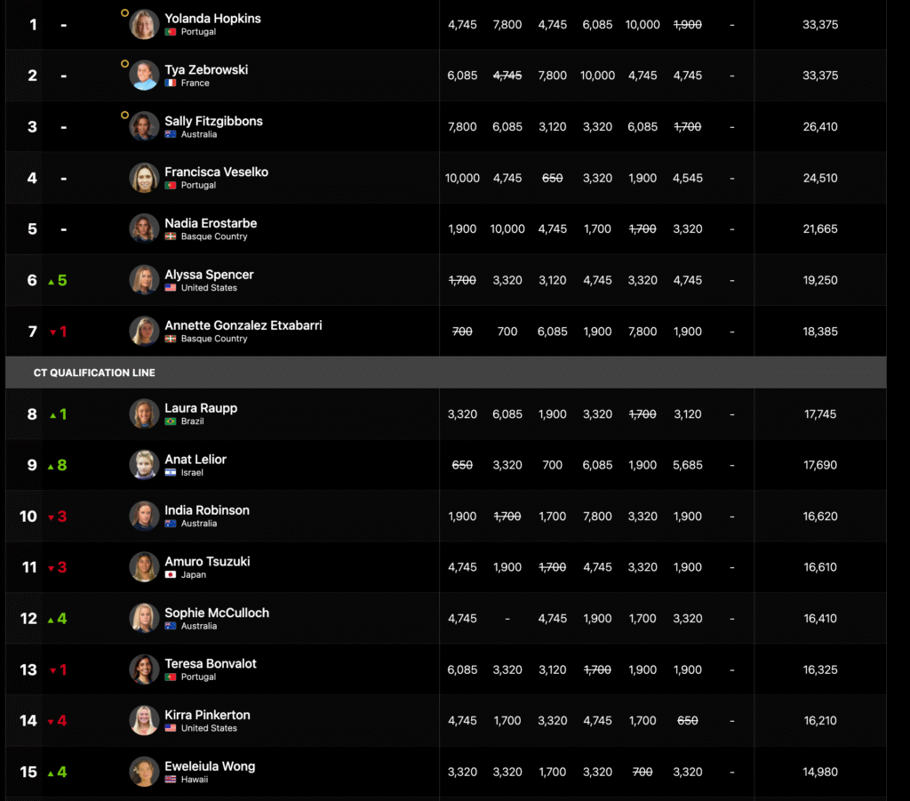 Three of the women in the top seven have spent a season on the CT before — Nadia, Sally, and Alyssa. Five of the top seven are from Europe, which is remarkable when you consider the fact that there is not a single European surfer currently on the CT.
