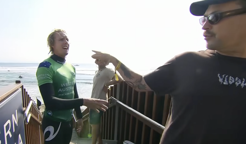The real event of the day was between Jacob Willcox and Yago Dora, and none of it really happened in the water. Yago turned to take off on a wave but had to pull back when Jacob appeared underneath him. Both thought it was interference. Two out of five judges did too, but majority rules. Still, neither surfer played the whistle. None of them checked their watches or heard the judges, until Jacob rode a wave that turned the heat ten minutes later.