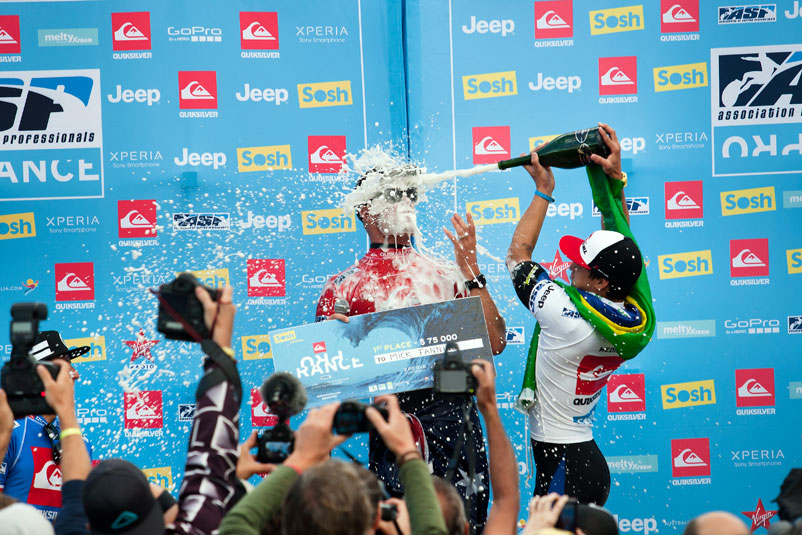 Mick says it’s satisfying to spray champagne in the eye of the man who beats you. Not so great to be on the receiving end as he was in France, howevs. Gabriel Medina unleashes. ASP/Cestari
